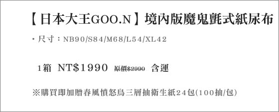 商品訊息簡述: 只要1990元(含運)即可購得【日本大王GOO.N】原價2990元境內版魔鬼氈式紙尿布1箱,尺寸:NB90/S84/M68/L54/XL42,購買即加贈春風憤怒鳥三層抽衛生紙24包(100抽/包)。